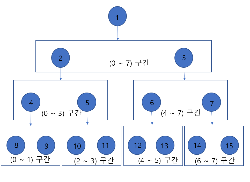 세그먼트 트리 작동방법 - 노드에 적혀 있는 번호가 배열의 인덱스 번호