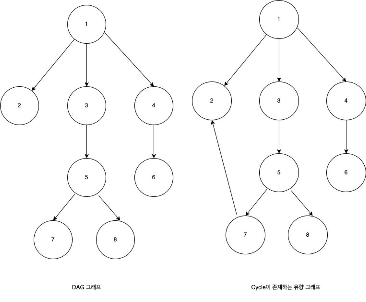 DAG : ( Directed Acyclic Graph) 비순환 그래프 구조 (Ex : Tree)
